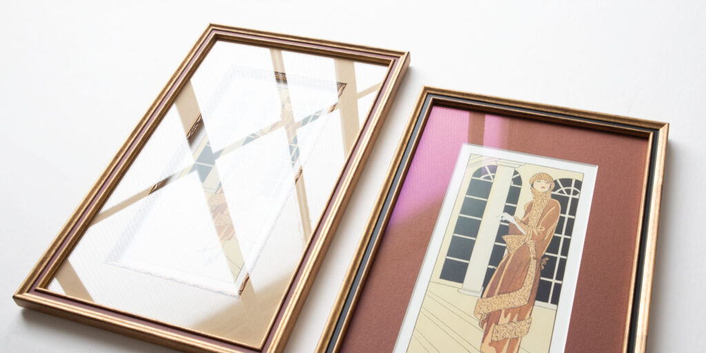 作品を保護するグレージング。低反射で紫外線防止機能があるものを選べば、作品の保護はもちろん、ストレスフリーな鑑賞が実現します。左右を見比べると、その差は歴然です。